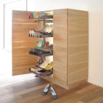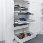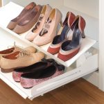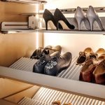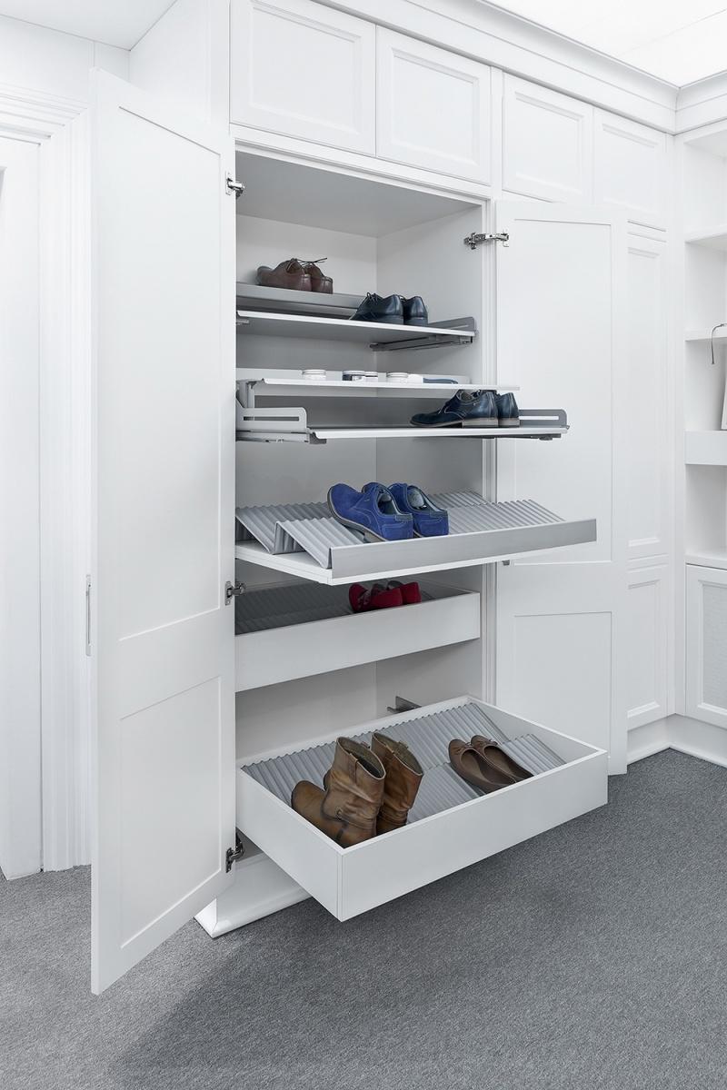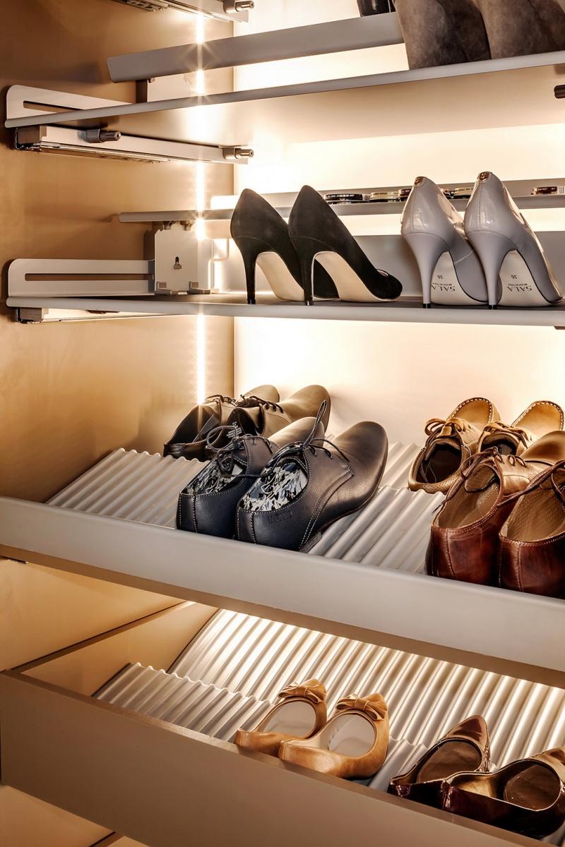 Do przechowywania butów służą specjalne wkłady, które mogą być umieszczone w szufladzie lub nałożone na płytę wysuwaną na prowadnicy. Wkłady można przycinać na dowolną szerokość. Wyprofilowane wytłoczki umożliwiają przechowywanie butów w dwóch rzędach, przy głębokości zabudowy 51 cm. Innym praktycznym sposobem przechowywania butów jest system EXTENDO w modułach 600 i 900 z nadstawianą półką, która może być ustawiona pod trzema różnymi kątami. Dzięki dodatkowej półeczce możemy, na stosunkowo ograniczonej powierzchni, wygospodarować dodatkowe miejsce nie tylko na buty, ale też np.: na środki do pielęgnacji obuwia, łyżki do butów lub prawidła. Kolejnym sposobem przechowywania butów jest półka wykonana z kratownicy, mocowana do bocznej ściany szafki.