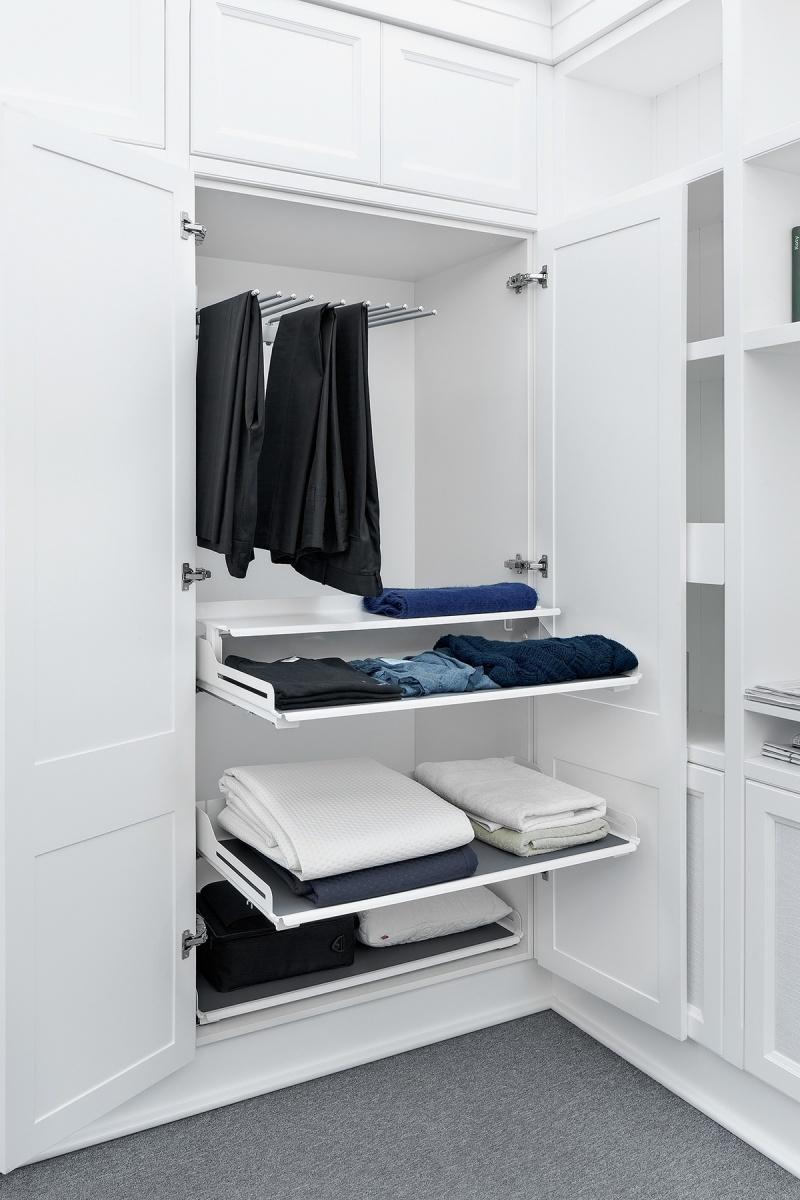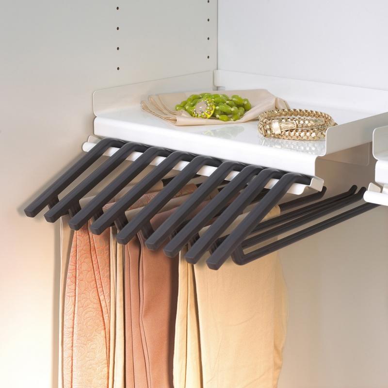 Praktycznym rozwiązaniem jest system do przechowywania spodni LINA. Wieszaki mogą być umieszczone zarówno na tradycyjnym drążku np. w górnej części szafy, jak i w dolnej części, na półce Libell, która dodatkowo ułatwia przechowywanie akcesoriów do odzieży. Półka może być zamontowana zarówno z prawej, jak i z lewej strony szafki, pozwala na zawieszenie i wyjmowanie wieszaków, które można swobodnie przesuwać.