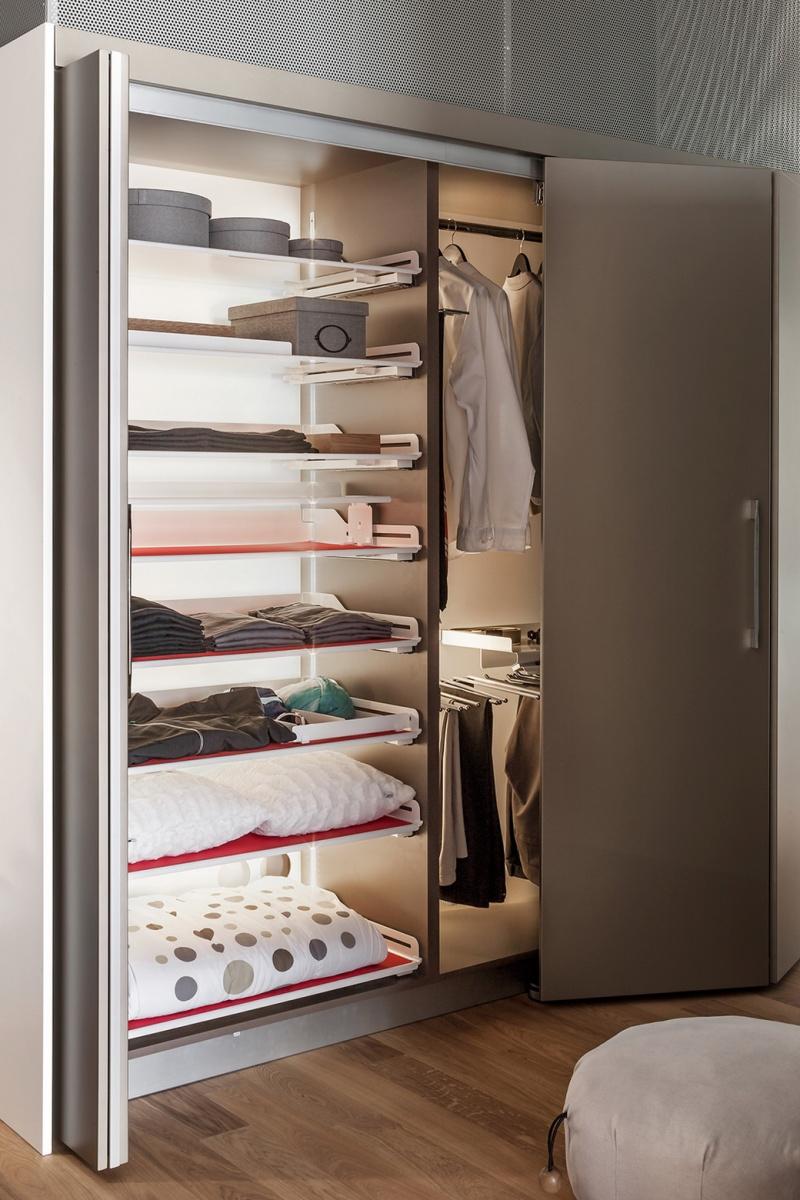 W roli garderoby najlepiej sprawdzi się system drzwi chowanych do wnęki pomiędzy korpusami HAWA-Folding Concepta, który umożliwia łatwe otwarcie całej szafy. Przy zastosowaniu dwóch takich systemów uzyskujemy wnękę o szerokości 280 cm. Osiągniemy dzięki temu gładką powierzchnię mebla, a po rozsunięciu skrzydeł — przestrzenną garderobę. System znajduje zastosowanie w garderobach umiejscowionych w sypialniach.