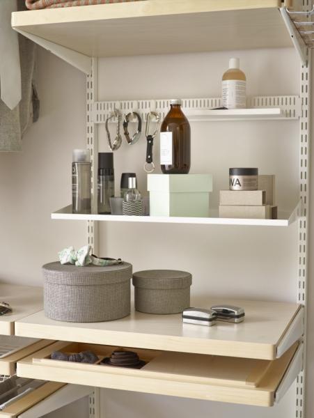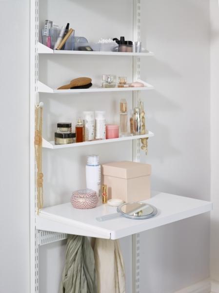 Rano potrzebujemy chwilę, aby przygotować się do rozpoczęcia nowego dnia – będzie nam wygodniej, jeśli wszystkie niezbędne akcesoria zgromadzimy w jednym miejscu. Wykorzystajmy w tym celu toaletkę – wystarczą nam dwie pionowe listwy, na których możemy zawieszać półki na dowolnej wysokości – proste lub z wgłębieniem na akcesoria, kosze oraz wieszaki. Kącik urody możemy umieścić za drzwiami przesuwnymi, aby nikt nie poznał sekretów naszej urody.