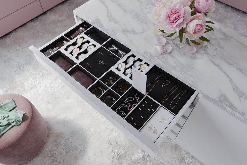 Oba warianty wkładów do Slim Box dostępne są w 6 modułach, które można dowolnie zestawiać i konfigurować, tak aby dopasować je i do specyfiki szuflady, i do własnych potrzeb. Wygodne gniazda i komory różnej wielkości uniemożliwią drobiazgom przesuwanie się i mieszanie, a także zabezpieczą je przed uszkodzeniem. Wyłożone aksamitem wnętrze przegród eliminuje ryzyko zarysowania czy zmatowienia błyszczących zegarków, biżuterii czy okularów.