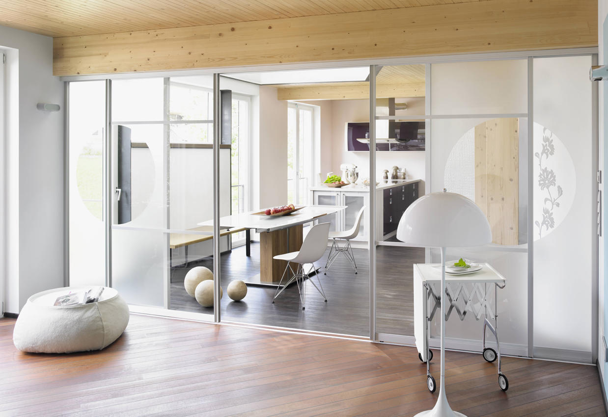 Firma raumplus oferuje ultracienki aluminiowy profil o szerokości zaledwie 1,5 cm. Niemal Prawie niewidoczna rama harmonijnie komponuje się zw wystrojem domu i nie wywołuje skojarzenia z przestrzeniami publicznym. Elegancki charakter dodatkowo podkreślają wykończenia w postaci czarnej anody lub kolorowych lakierów. Systemy szklanych paneli i drzwi raumplus przeznaczone są do wydzielania z większej powierzchni dodatkowych pomieszczeń np.: jadalni, gabinetu lub garderoby. Szkło zapewnia przenikanie światła między pomieszczeniami, nadaje wnętrzu lekkości i elegancji. Inną jego zaletą jest ograniczenie przenikania dźwięków i zapachów. Marksymalny wymiar pojedynczego panelu wynosi 1,5 x 3,5 m.
