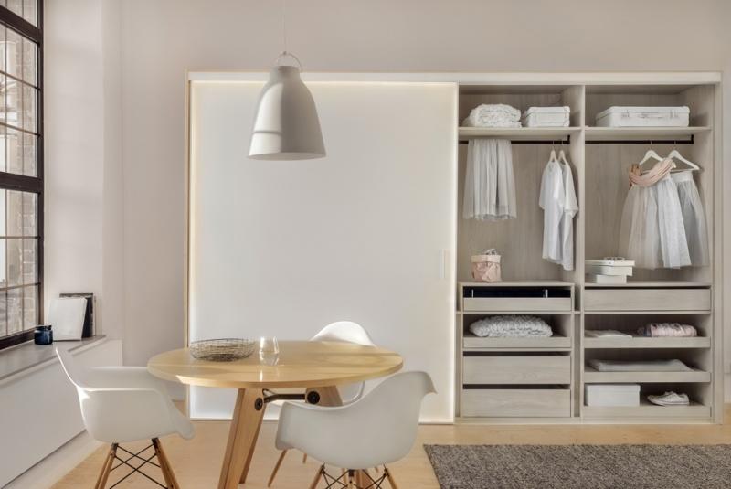 Jasne drewno we wnętrzach to jeden z najsilniejszych trendów. Ten rodzaj wykończenia świetnie łączy się z bielą, pastelami i złotem, tworząc przyjazną pełną powietrza przestrzeń. Raumplus proponuje, aby w stylu skandynawskim zaprojektować szafę na ubrania i dodatki.