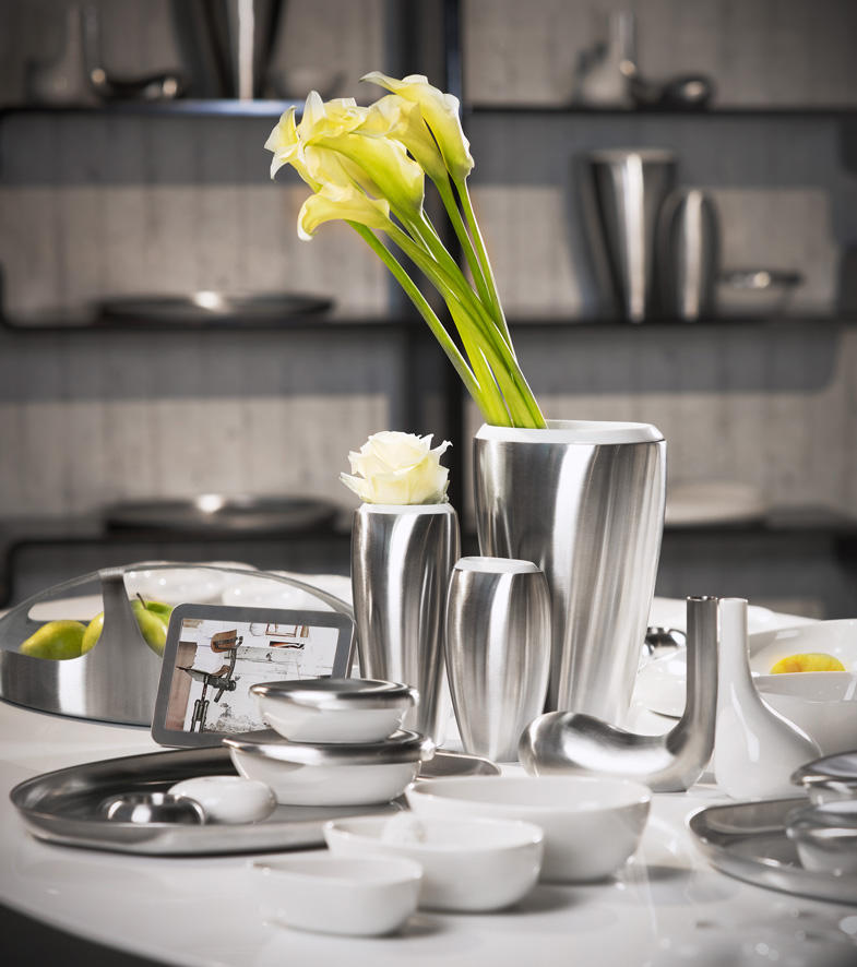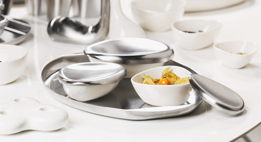 W linii Fusion Goods znajdziesz też praktyczne miseczki do dipów. Są dostępne w trzech wielkościach i mają stalowe pokrywki, które w razie potrzeby mogą spełniać funkcję talerzyków. Miseczki mają owalny kształt delikatnie nawiązujący do trójkąta, dlatego można tworzyć z nich dekoracyjne kompozycje. Do eleganckiego serwowania dań i przekąsek wybierz tacę z kolekcji Fusion Goods. Posiada ergonomiczne uchwyty, dlatego jest praktyczna i wygodna w użyciu. Wyjątkowy nastrój we wnętrzu stworzysz dzięki świecznikom i podgrzewaczom z kolekcji Fusion Goods. Dzięki organicznym kształtom, stanowią one niebanalny gadżet do salonu, jadalni, ale też do pokoju kąpielowego. Miłośnicy kwiatów zapewne zdecydują się na wazony Fusion Goods. Są one dostępne w trzech rozmiarach i mają podobny kształt, dlatego doskonale wyglądają zarówno razem jak i osobno, rozstawione w różnych częściach salonu.