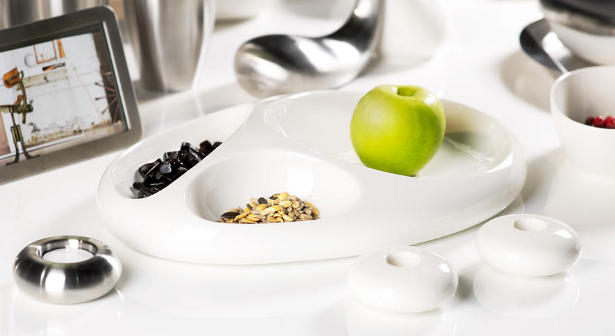 Istnieją materiały, które wyróżnia ponadczasowe piękno – to szlachetna biel porcelany czy chłodny błysk stali. Teraz Villeroy & Boch połączył je w plastycznych i płynnych kształtach akcesoriów wnętrzarskich – Fusion Goods. Kolekcję wyróżniają biomorficzne kształty i wyjątkowa jakość. Jak sprawić, aby jadalnia czy salon zyskały nowe oblicze? Wystarczy wybrać dla nich wyjątkowe dekoracje. Duży porcelanowy talerz z metalową podstawą o organicznych, nieregularnych kształtach można postawić na ławie czy dużym stole. Będzie pełnić rolę praktycznej patery na owoce albo ozdoby, która przyciągnie zarówno smakoszy, jak i amatorów dobrego wzornictwa. Na suszone owoce, orzechy czy pestki dyni, najlepiej wybrać porcelanową misę. Jest ona podzielona na trzy segmenty o różnej wielkości, dlatego jednocześnie można serwować na niej kilka rodzajów smakołyków.