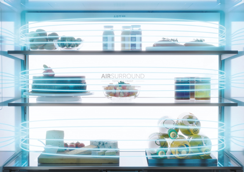 Oprócz wspomnianego wcześniej systemu ABT PRO, który zapewnia bezpieczeństwo i czystość nie tylko wody i kostek lodu, ale również chłodzonych i zamrażanych produktów urządzenie wyposażone zostało w szereg technologii Fresher Techs. Wszystko po to, by twoja żywność pozostała na dłużej świeża i zachowała swój oryginalny smak. Specjalna szuflada Humidity Zone szczególnie zadba o twoje ulubione owoce i warzywa, zwłaszcza latem, kiedy jest najlepszy czas na sezonowe przysmaki. Membrana z włókien roślinnych utrzymuje wilgotność na poziomie 90% i automatycznie nią zarządza, co pozwala uniknąć kondensacji wody wewnątrz szuflady. Odpowiednia cyrkulacja chłodnego powietrza wewnątrz strefy sprawia, że przechowywane artykuły spożywcze dłużej zachowują swoje wartości odżywcze. Dla produktów wymagających indywidualnych potrzeb chłodzenia została stworzona również szuflada My Zone Plus, która pozwala jednym dotknięciem stworzyć optymalne warunki dla chłodzonych w niej produktów. Możesz ustawić temperaturę w szufladzie w zakresie od -1°C do +3°C, pamiętając o tym, że przedział od -1°C do 0°C jest idealny dla mięs, +1°C do +2°C dla warzyw, a +3°C to najlepsza temperatura dla owoców. Dodatkowo, lodówka wyposażona została w system poziomego przepływu powietrza Air Surround Cooling, w którym dysze chłodnego nawiewu znajdują się na każdej półce. Pomaga to w utrzymaniu jednolitej temperatury w całej chłodziarce i stanowi gwarancję, że przechowywana żywność będzie dłużej świeża, a zapachy nie będą się mieszać. Dzięki temu rozwiązaniu zapobiegniesz marnowaniu żywności. Zwłaszcza, że część produktów możesz również bezpiecznie zamrozić. W zależności od twoich aktualnych potrzeb specjalna strefa Switch Zone daje możliwość swobodnego przełączania pomiędzy chłodzeniem, a zamrażaniem w tym samym obszarze lodówki. Za pomocą cyfrowego wyświetlacza, znajdującego się na drzwiach urządzenia, zmienisz ustawienie temperatury w zakresie od -18°C do +5°C, od ciebie zależy czy większa będzie przestrzeń do zamrażania, czy do chłodzenia. A o bezpieczeństwo mrożonej żywności zadba Fresher Shield zmniejszając zużycie energii podczas automatycznego procesu rozmrażania. Rozwiązanie to ogranicza wahania temperatury i zapobiega przedostawaniu się ciepła z zewnątrz, co redukuje negatywny wpływ na trwałość i smak żywności niemal do zera. Przechowywane produkty zachowują swoje właściwości dwukrotnie dłużej niż w konwencjonalnej zamrażarce.