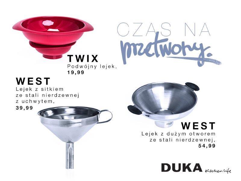 Trwałe, wykonane ze stali nierdzewnej lejki WEST z uchwytami do napełniania słoików i butelek są odporne na wysoką temperaturę. Większy z nich posiada wystarczająco szeroki otwór, aby przelać konfitury z dużymi kawałkami owoców, mniejszy z kolei został wyposażony w sitko, które zatrzyma podczas przelewania niepotrzebne osady i cząstki.