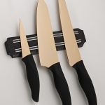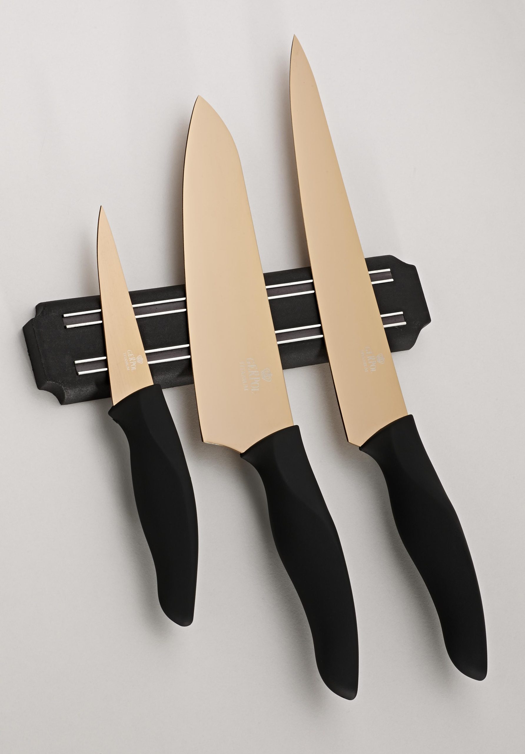 z noża kuchennego (19 cm), noża szefa kuchni (16 cm), noża do warzyw (9 cm) oraz praktycznej listwy magnetycznej, ułatwiającej ich przechowywanie. Najczęściej noże trzyma się w szafkach lub szufladach, gdzie luźno ułożone rysują się i tępią, a także stanowią ryzyko skaleczenia podczas ich szukania. Listwa umożliwia natomiast ich wygodne powieszenie na ściennie – w ten sposób nie niszczą się, a my możemy je bezpiecznie zdjąć. Tak wyeksponowane noże będą nie tylko przydatnym wyposażeniem kuchni, ale również wyjątkową ozdobą wnętrza. Na uwagę zasługuje również ich wyjątkowo atrakcyjny wygląd o lekko czerwonej poświacie, dzięki czemu kolekcja zawdzięcza swoją nazwę Titanum Rose. Warto również podkreślić, że kolekcja Titanum Rose marki Gerpol to doskonały pomysł na prezent. Zapakowane w eleganckie pudełko będą stanowić wyjątkowy upominek zarówno dla kobiety, jak