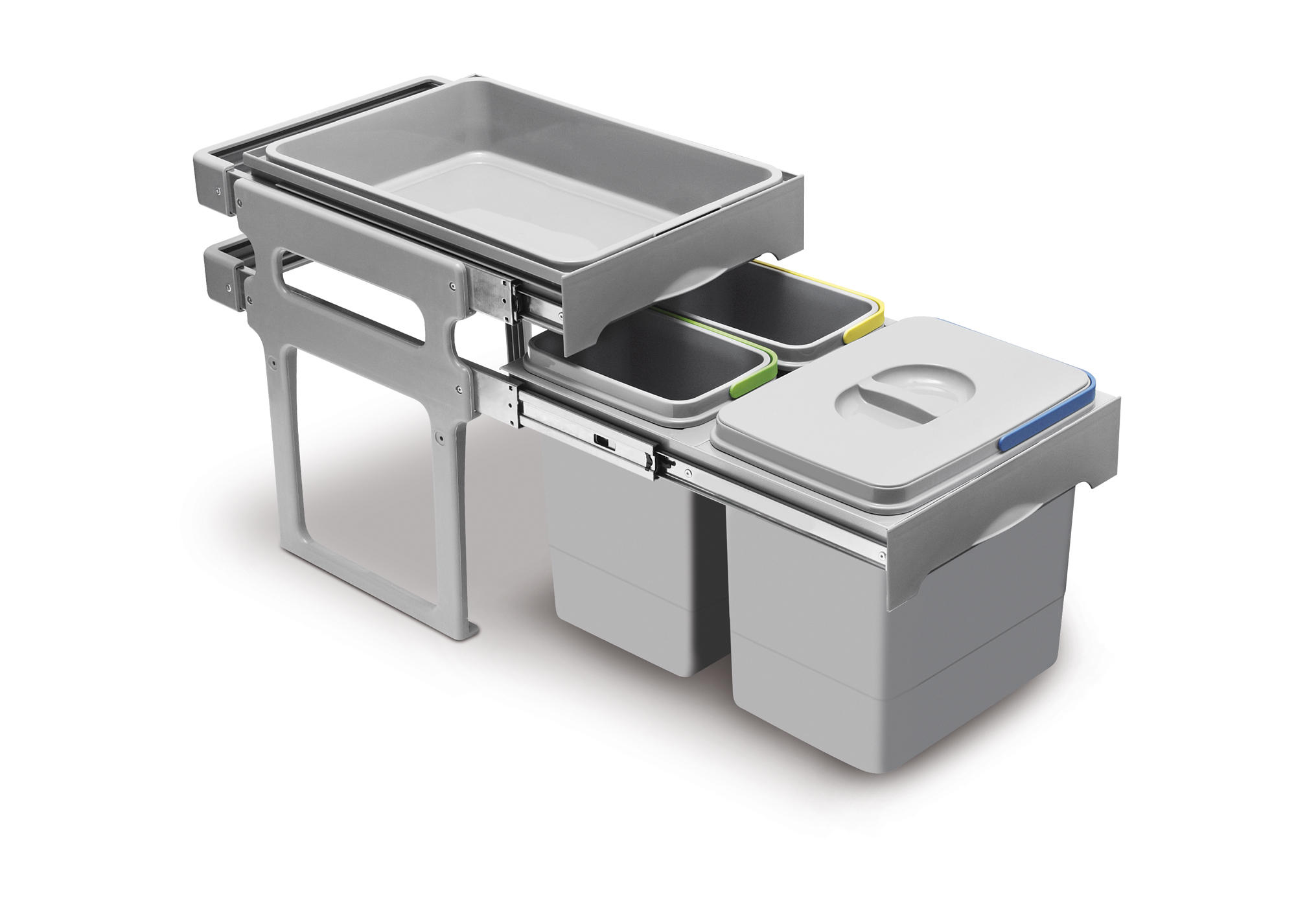 Nowy model włoskich koszy FORZA posiada jeden kosz o pojemności 16 l oraz dwa mniejsze kosze, każdy o pojemności 8l. Dodatkowo zamontowana jest wielofunkcyjna wysuwana taca.
