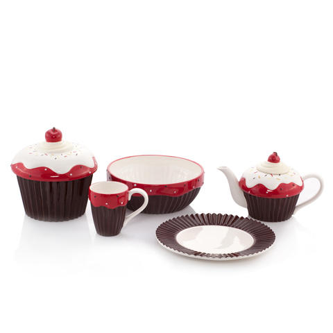 Skoro słodycze dobrze wpływają na nastrój to zacznijmy dzień od śniadania z zestawem Muffin. Znajdziemy w nim talerzyk, miskę, kubek, czajnik i pojemnik… wszystko stylizowane na przepyszne czekoladowe babeczki przyozdobione lukrem, z wisienką na szczycie. Na takiej zastawie, nawet największy niejadek ze smakiem spałaszuje małe co nieco.