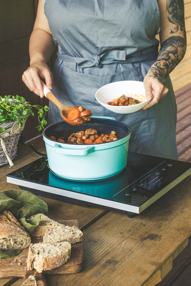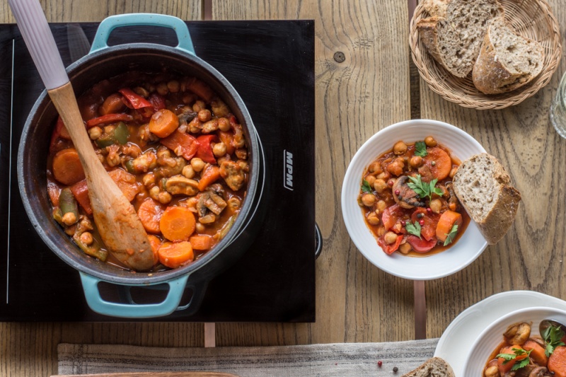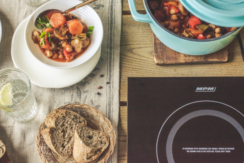 Przy pomocy kuchenki indukcyjnej MPM możesz szybko przygotować warzywny gulasz z ciecierzycą. D