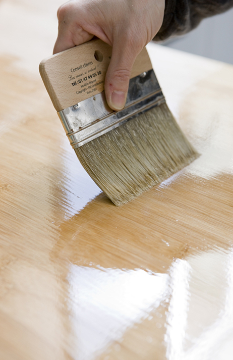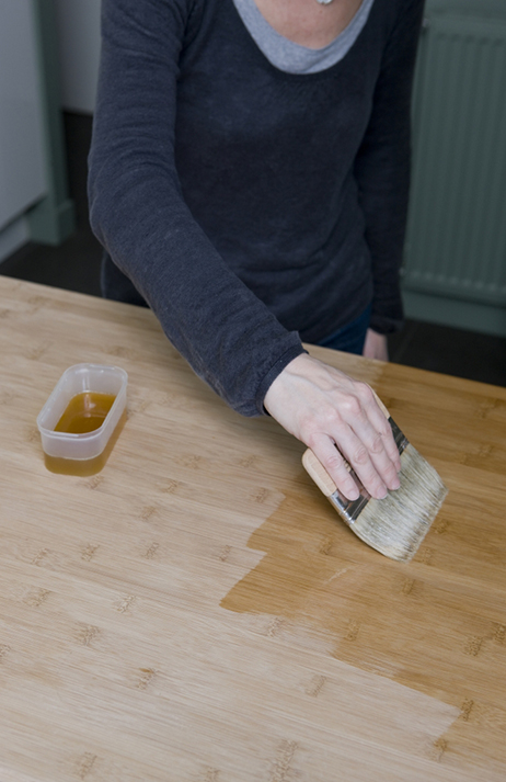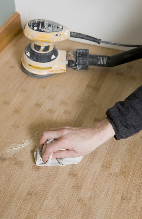 Podstawą zabezpieczenia blatu jest prawidłowe przygotowanie materiału. Drewno surowe szlifujemy drobnoziarnistym papierem ściernym i odpylamy. W przypadku surowca pokrytego woskiem, lakierem lub farbą, pracę rozpoczynamy od usunięcia warstwy preparatu, np. za pomocą Środka do usuwania powłok V33. Całość szlifujemy, aż do odsłonięcia drewna, i odpylamy.
