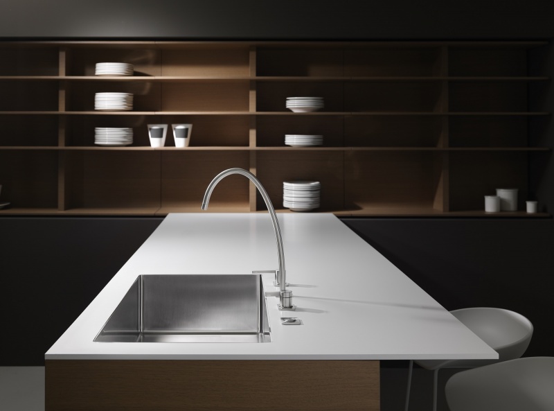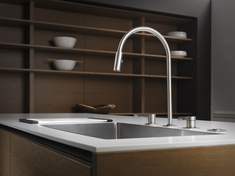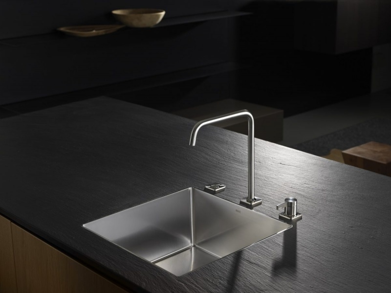 Miłośnikom symetrii i idealnych proporcji spodoba się natomiast trzeci wariant baterii KWC ERA, gdzie geometryczny profilu stalowej wylewki wyznacza ramy i zakres pracy w kuchennej strefie wody. Tak zwyczajna i prosta forma baterii jest doskonałym dopełnieniem dla stalowych zlewozmywaków z kolekcji o tej samej nazwie.