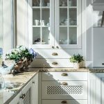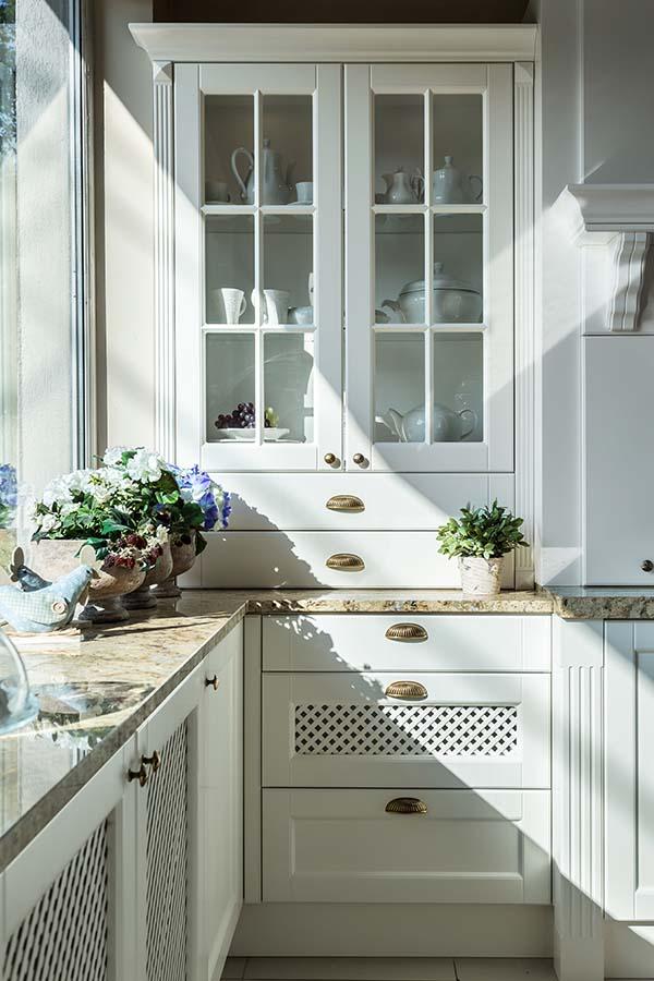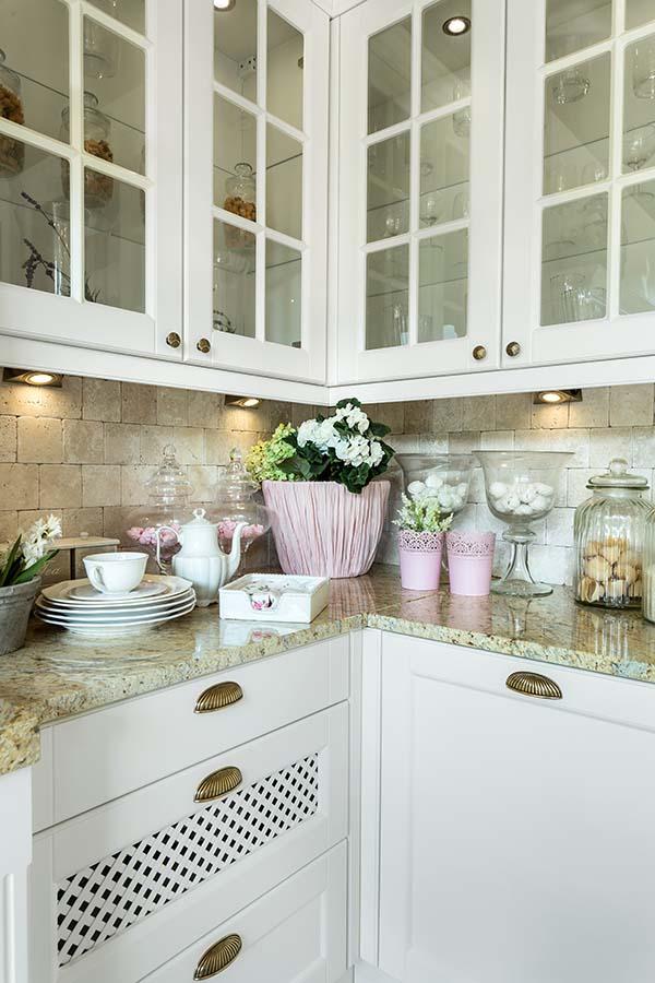 Klimat rustykalny tworzy jednak nie tylko drewno i jego pochodne. To szereg innych surowców, z których wykonuje się dodatki, elementy wykończeniowe, kuchenne akcesoria. Idealnie z tym stylem współgrają naturalne kamienie jak granit czy marmur, ale i konglomeraty. Mogą pojawić się one w postaci blatów roboczych, parapetów lub jako dodatki. Podobną rolę uzupełniającą pełni ceramika. Jako ozdobne naczynia, kubki, talerze świetnie prezentuje się na tle rustykalnego klimatu. Można ją też zastosować w postaci ściennych płytek lub jako murki, w które wbudowuje się szafki kuchenne. Płytki ceramiczne powinny być jednak dobrane kolorem, formą i wzorem do stylu, dobrze jest stronić od szkliwionych na wysoki połysk, dużych tafli, które zdecydowanie lepiej prezentują się w bardziej współczesnych wnętrzach. Klimat rustykalnej kuchni dopełnią zdobienia czy wykończenia z żeliwa, miedzi lub kutego żelaza – mogą mieć postać ozdobnych uchwytów do szafek, zewnętrznych zawiasów czy pojemnika na drewno stojącego w pobliżu kominka lub kaflowego pieca.