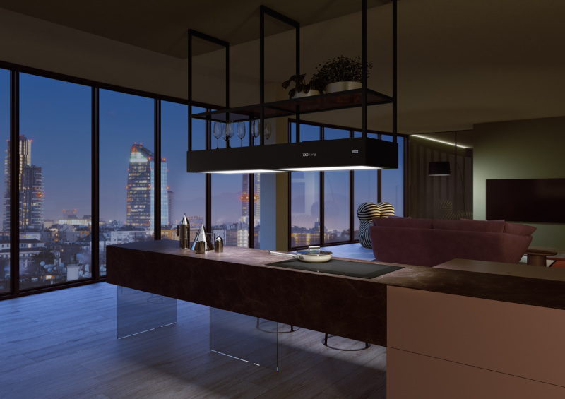 Designerski okap do kuchni z wyspą może stać się elementem definiującym charakter całego wnętrza. W tej roli doskonale sprawdzają się wielofunkcyjne urządzenia Mythos T-Shelf. To nie tylko wydajny okap, ale również lampa z regulacją natężenia i barwy światła. Model wyposażony jest w szklane półki, które – przy długości aż 180 cm – oferują wyjątkowo dużo miejsca do przechowywania. Można na nich ustawić doniczki z ziołami, przyprawy, książki kucharskie czy ulubione akcesoria kuchenne.
