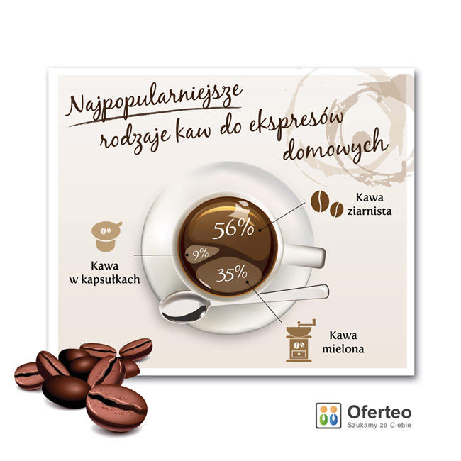 Użytkownicy ekspresów mogą wybierać spośród różnych rodzajów kawy. „Najpopularniejsza jest kawa ziarnista. Chęć korzystania z niej deklaruje ponad połowa (56%) składających zapytanie w serwisie Oferteo.pl. Co trzecia osoba poszukująca ekspresu do użytku domowego (35%) preferuje kawę mieloną” – mówi Karol Grygiel, członek zarządu Oferteo.pl. „9% zapytań o ekspresy do kawy dotyczy modelu przygotowującego kawę z kapsułek. To urządzenie pozwala szybko i łatwo przyrządzić kawę, korzystając ze specjalnych nabojów zawierających mieszankę kawy mielonej” – dodaje Grygiel.