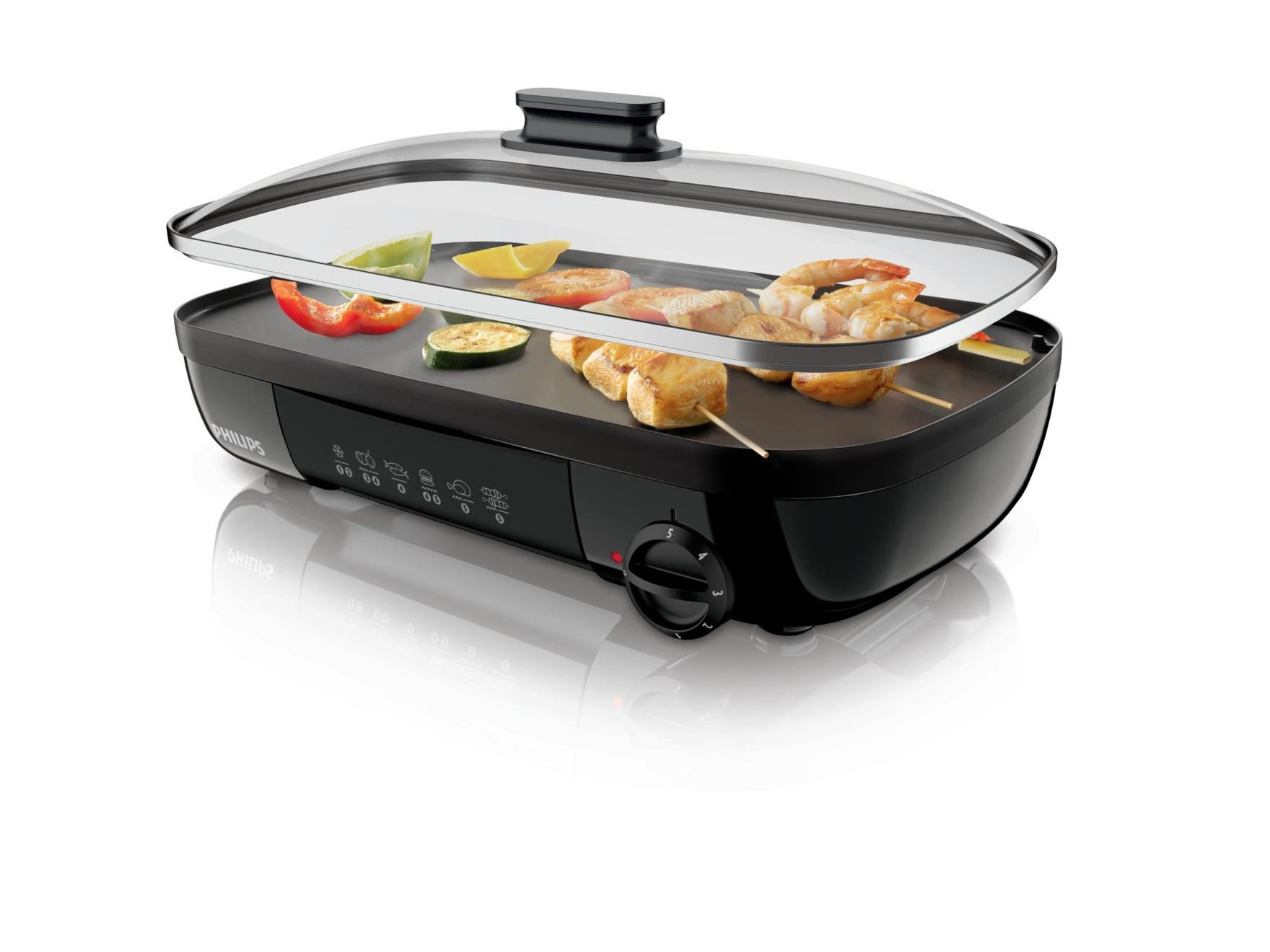 Najnowszy grill Philips Viva Collection pozwala na przygotowywanie smacznych, różnorodnych i zdrowych potrawy bez dodatku oleju przez cały rok. Dwustronna płyta grillująca nadaje się zarówno do delikatnych potraw jak warzywa czy owoce morza – strona gładka, jak i do grillowania mięs – strona karbowana. Nadmiar tłuszczu jest odprowadzany do specjalnej tacki, co ogranicza powstawanie nieprzyjemnego zapachu i dymu.