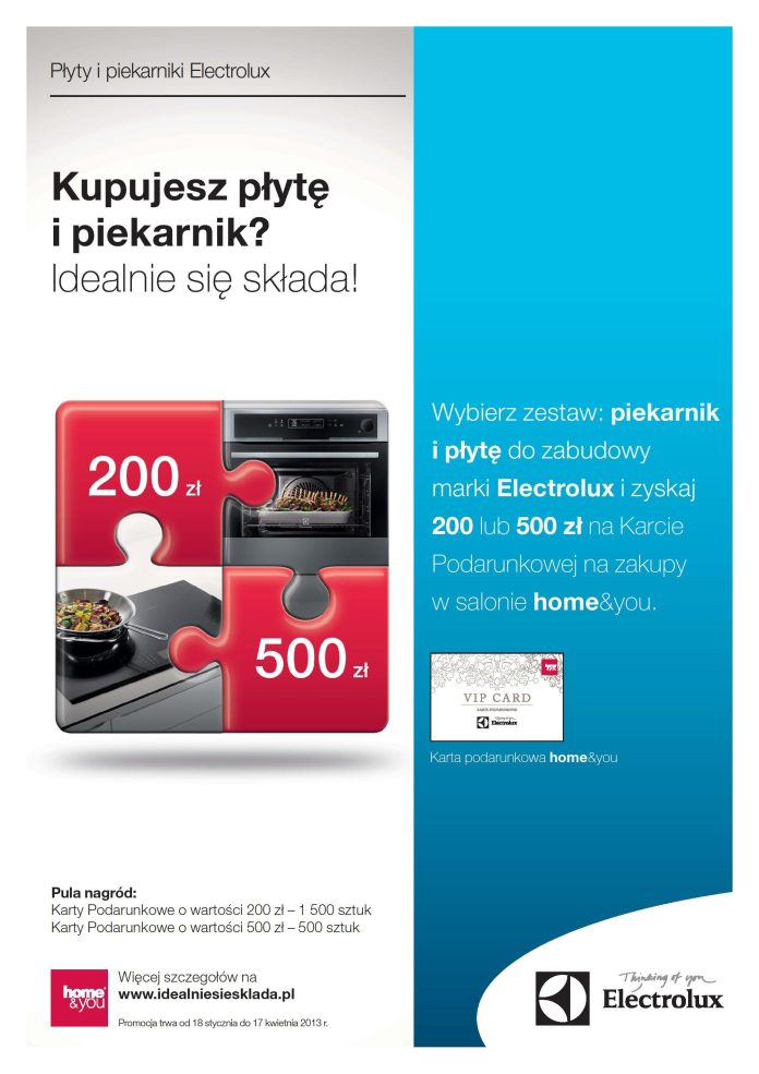 Urządzasz nowe mieszkanie albo remontujesz stare i wymieniasz urządzenia AGD? Idealnie się składa, ponieważ Electrolux przygotował specjalną promocję. Każdy zakup zestawu składającego się z dowolnego modelu płyty i piekarnika do zabudowy Electrolux jest premiowany Kartami Podarunkowymi o wartości 200 zł lub 500 zł do wykorzystania w salonach home&you. Promocja trwa od 18 stycznia do 17 kwietnia 2013 r.