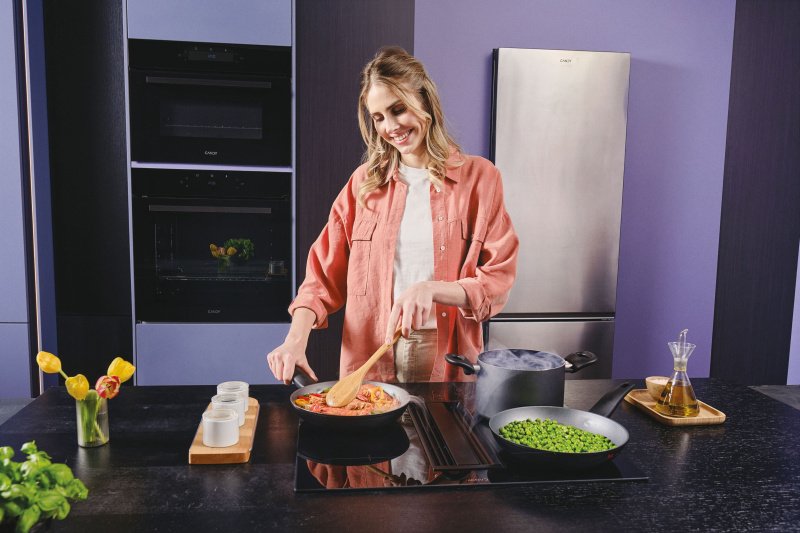 Nowy design marki charakteryzuje również płyty grzewcze i okapy, w tym absolutną nowość. Candy Cook Induction Hood to płyta indukcyjna ze zintegrowanym okapem i nowymi funkcjami, które oferują innowacyjne doświadczenia podczas gotowania. Rozwiązanie, które po raz kolejny ulepsza codzienne życie dzięki funkcjom, które sprawiają, że idealnie nadaje się do każdego stylu życia, oszczędzając czas i energię oraz dostosowując się do każdej kuchni i otoczenia. Okap indukcyjny Candy Cook to urządzenie dwa w jednym, które zapobiega rozchodzeniu się oparów po całym wnętrzu, utrzymując kuchnię świeżą i czystą: smażenie lub gotowanie ryb jest teraz proste, niezależnie od wielkości pomieszczenia, w którym gotujesz. Candy zdaje sobie sprawę, że każda kuchnia jest wyjątkowa, dlatego oferuje dwie różne metody instalacji – wersję z wyciągiem lub wersję z filtrem węglowym – oraz dwa różne rozmiary (60 cm lub 80 cm). Okap jest bardzo łatwy w obsłudze, a wszystkimi strefami gotowania można sterować bezpośrednio z centralnego panelu sterowania na płycie grzewczej. A dzięki funkcji Keep Warm jedzenie może być utrzymywane w cieple do momentu podania, aby poczekać na spóźnialskich lub po prostu móc dłużej porozmawiać przy stole.