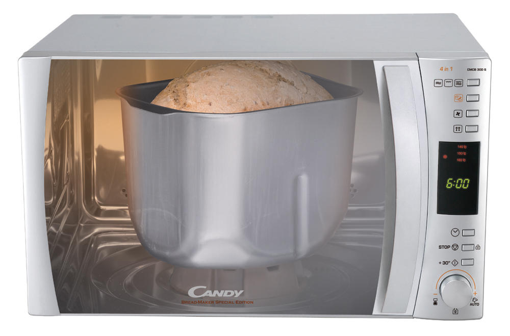 I choć trudno na co dzień zrezygnować z kupowania chleba to jednak od czasu do czasu można pozwolić sobie na samodzielny wypiek. Mylą się Ci, którzy sądzą, że pieczenie chleba musi być czasochłonnym i skomplikowanym rytuałem. Kuchenka mikrofalowa CMCB 9730DS marki Candy powoli zrobić to szybciej. W wyposażeniu kuchenki jest metalowy pojemnik (forma) do pieczenia chleba z nożem do wyrabiania ciasta. Wystarczy kupić gotową mąkę z drożdżami i dodatkami do wypieku chleba. Wsypujemy do pojemnika, dodajemy wodę w zalecanych proporcjach i wstawiamy do mikrofali. Ustawiamy funkcje pieczenia chleba i po jakimś czasie możemy się cieszyć pachnącym wypiekiem.