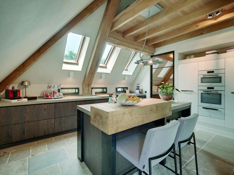 Drewniane okna FAKRO idealnie komponują się z belkami konstrukcyjnymi oddzielającymi kuchnię od przestrzeni wypoczynkowej na poddaszu.