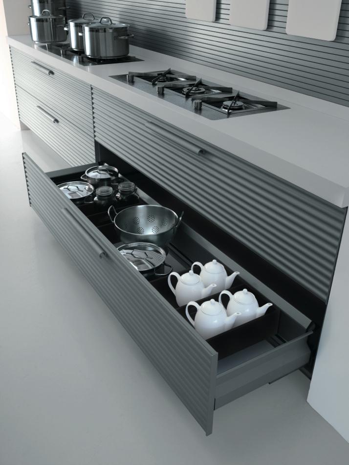 Ciemne wykończenie aluminiowych frontów przypomina niklowaną stal. Efekt ten osiągnięto dzięki kosztownemu procesowi anodowania aluminium. Anodowane aluminiowe fronty charakteryzują się elegancją, odpornością na uszkodzenia i precyzją wykonania. Wysoka zabudowa szaf może zostać wykończona w lakierze matowym lub błyszczącym. Powierzchnie są lakierowane wielowarstwowo. Lakier suszony jest promieniami UV, dzięki temu jest bardzo odporny i nie zmienia koloru pod wpływem światła słonecznego. Najnowszym, zaprezentowanym na Salone del Mobile 2011, rodzajem wykończenia jest aluminium w kolorze tytanu.