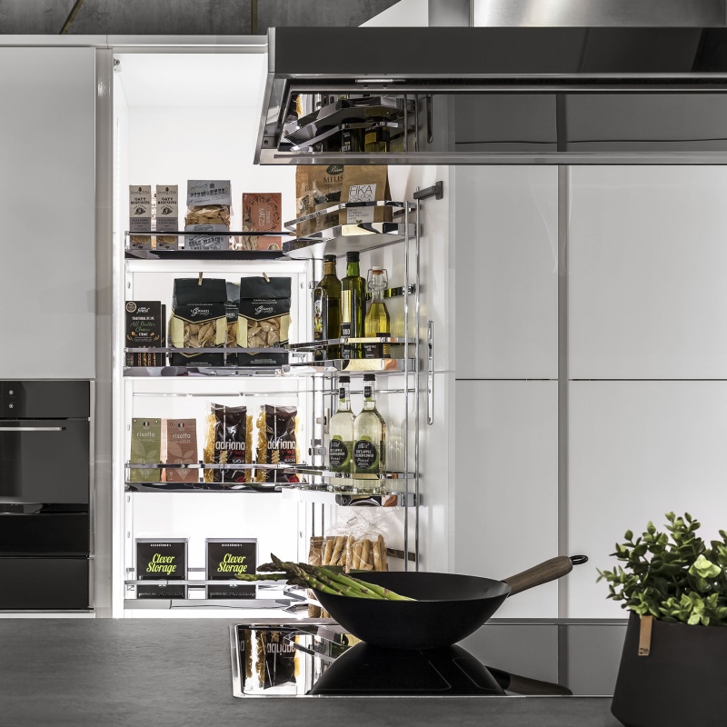 Najwygodniejsze są systemy cargo – po wysunięciu cała ich zawartość jest łatwo dostępna. To tutaj gromadzimy zapasy żywności. Wyciągi wysokie DISPENSA czy TANDEM pozwolą na uporządkowanie produktów i lepsze wykorzystanie dostępnego miejsca. Wystarczy otworzyć front takiej spiżarni, a półki samoczynnie wyjeżdżają do przodu, ułatwiając wyjmowanie i wkładanie zapasów.