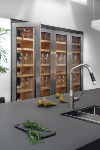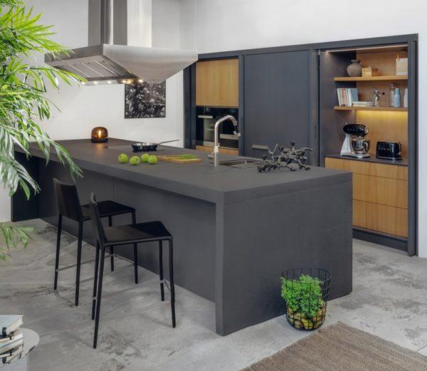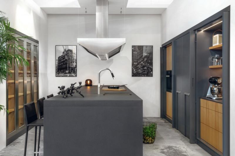 Dla modelu charakterystyczne są frezowane fronty wyspy i wysokich szaf, wykończone w matowym grafitowym lakierze. Spośród innych modeli poznańskiego producenta, NY wyróżnia się zastosowaniem dużej ilości stalowych elementów. Wykonane są z nich fronty witryny oraz uchwyty w formie długich, ustawionych pod kątem listew. Błyszczące metalowe powierzchnie zestawione są z ciepłym odcieniem naturalnego dębowego forniru, który pojawia się w wewnątrz wysokiej zabudowy. Kuchnia NY ma również specjalnie zaprojektowane organizery do szuflad. Pozwalają one na swobodne formowanie przegródek przy pomocy ruchomych stalowych elementów wsuwanych w żłobienia drewnianej podstawy. Blat wyspy wykonany został z kamienia spiekowego Lapitec. Nie wchłania on płynów, jest odporny na plamy, a ponadto charakteryzuje się wysoką twardość i jest odporny na uszkodzenia. W modelu materiał zastosowano w porowatym wykończeniu „Vesuvio”, które przypomina płomieniowany i szczotkowany granit.