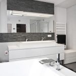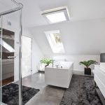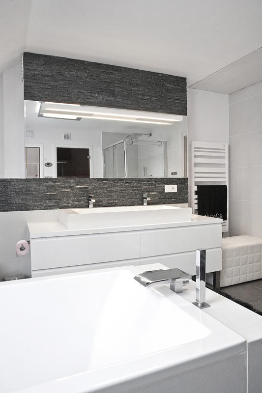 Salon kąpielowy był projektowany niemal bez ograniczeń tak, aby można było swobodnie zaplanować i przemyśleć każdy szczegół. Przestrzeń pozwoliła na zastosowanie wygodnej, dwuosobowej wanny, która jednym końcem wspiera się na podeście. Kabina prysznicowa w imponującym rozmiarze 120 cm x 90 cm została usytuowana tuż przy wejściu do sauny kryjącej się za drzwiami z antracytowego szkła. Na ścianach został położony delikatny gres w kolorze szarawej bieli oraz czarny granit, pozostawiono również duże powierzchnie pokryte tynkiem. Dzięki temu uzyskano wrażenie dużego pokoju kąpielowego.