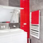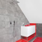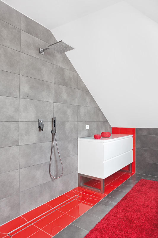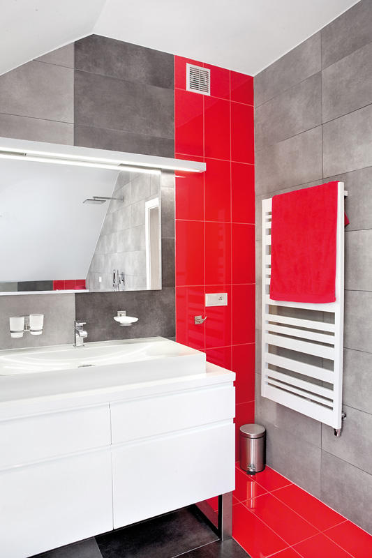 Prywatna łazienka gospodarzy jest usytuowana na poddaszu. Akcent czerwieni pojawił się na życzenie Pani inwestor – to jedyny taki zabieg kolorystyczny w całym domu. Konsekwentny pas przemykający z posadzki na ściany zaznacza obecność karminowej dominanty. Całość została dopełniona antracytowymi płytkami w odcieniu surowego betonu. Podest z architektoniczną wanną Normana Fostera zdecydowanie wyznaczył strefę kąpielową. Część prysznicowa w przyszłości zostanie obudowana transparentną ścianą ze szkła. Odpływ liniowy w czerwieni wydaje się być niemal niezauważalny. Ciekawym rozwiązaniem okazały się płozy ze stali nierdzewnej, które stanowią podstawy pojemnych komód. To dzięki nim meble sprawiają wrażenie nieco lżejszych. Boki elementów sanitarnych, formą nawiązujące do geometrycznej wanny, zostały zaakcentowane czerwonym szkłem. W prezentowanym wnętrzu można zauważyć odstępstwo od zasady unikania stałych elementów kolorystycznych. Z reguły lepiej zastosować kontrastujące barwy na ruchomych nośnikach, tj. dekoracjach, doniczkach czy ręcznikach. W tym przypadku jednak odejście od reguły okazało się strzałem w dziesiątkę, ponieważ łazienka zyskała swój niepowtarzalny charakter. Warto jednak podkreślić, że takie rozwiązanie lepiej stosować w strefach prywatnych, dostępnych jedynie dla domowników.
