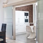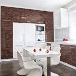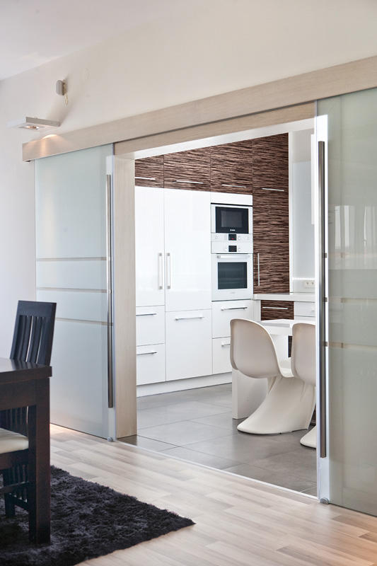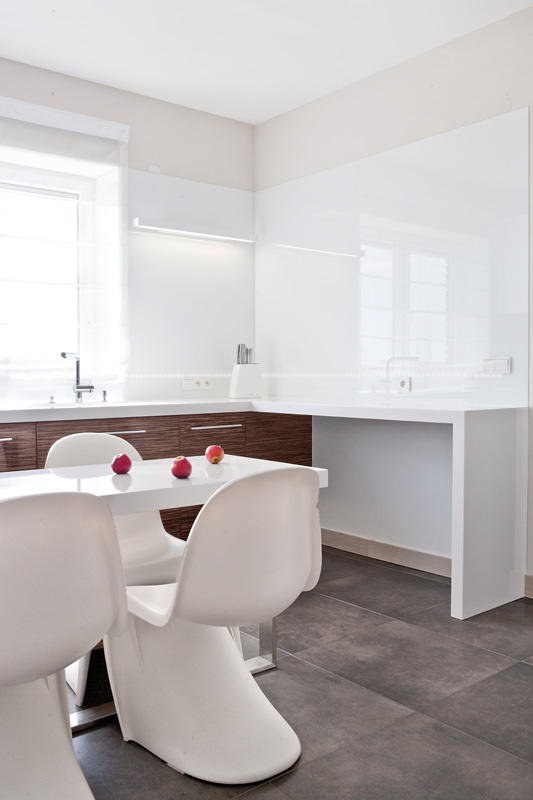 Charakter kuchni nawiązuje do części jadalni oraz salonu, które są widoczne przez podwójne drzwi przesuwne. Posadzka w odcieniu antracytowego betonu podkreśla minimalistyczny charakter całego rozwiązania. Z kolei subtelne odcienie bieli w połączeniu z jednym z najcenniejszych materiałów wśród fornirów, jakim jest heban podkreślają surowy klimat wnętrza. Dodatkowe pokrycie egzotycznego drewna politurą uwydatniło jego ciekawą strukturę. Uzupełnieniem jest osprzęt wykończony białym szkłem, który elegancko wkomponował się w zabudowę meblową. Nawiązaniem do mebli są ściany również wykończone szkłem. Ich połyskująca struktura optycznie powiększa przestrzeń.