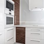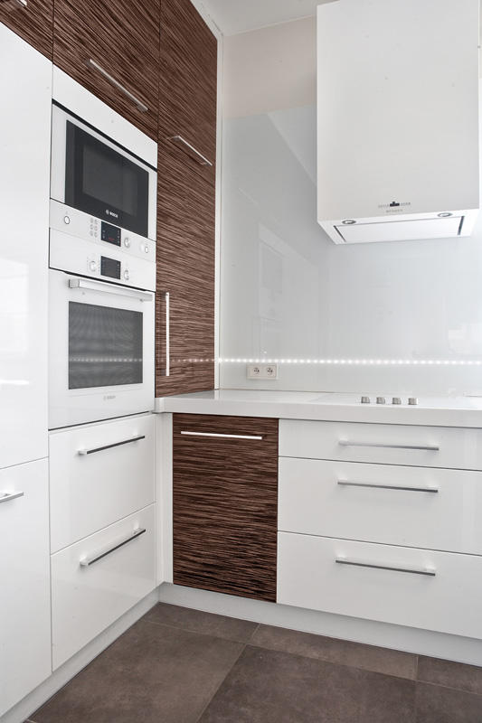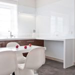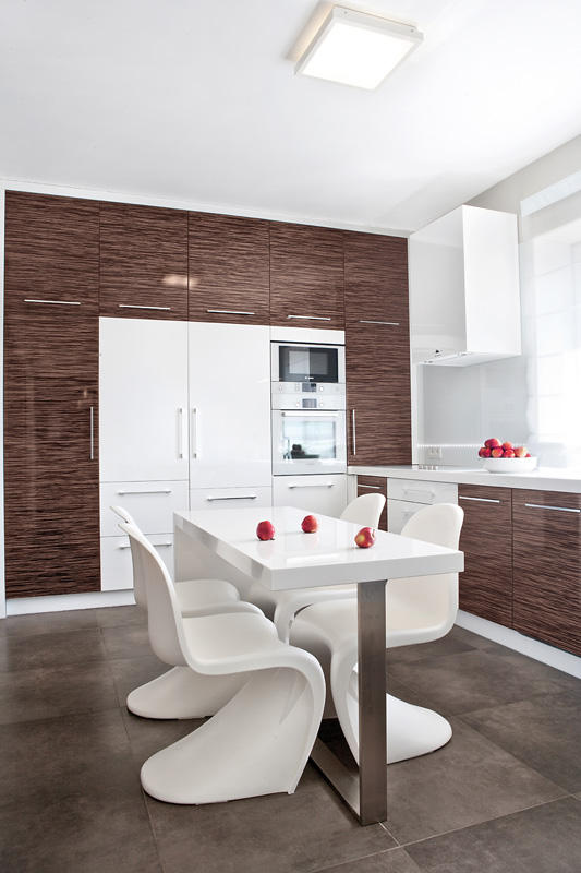 Kuchnia została precyzyjnie rozplanowana w sposób, który służy wygodzie domowników. Poziome pasy ledowe tła zostały umieszczone tuż nad blatem i wyznaczają część roboczą. Funkcję zlewu pełni tutaj ceramiczna podwieszona misa. Dzięki zastosowaniu takiego rozwiązania jest on prawie niezauważalny, został zasygnalizowany jedynie wysoką chromowaną baterią. Na samym środku pomieszczenia została umieszczona lada wykonana, podobnie jak blat, z corianu. Swoim kształtem przypomina wyspę, która służy jako mebel na szybkie posiłki oraz do zabawy dla dzieci, które mama zawsze woli mieć na oku. Natomiast wysoka zabudowa meblowa pełni funkcję dodatkowej spiżarki, kryjąc w sobie mnóstwo dogodnych systemów jak np. wysuwane szklane półki.