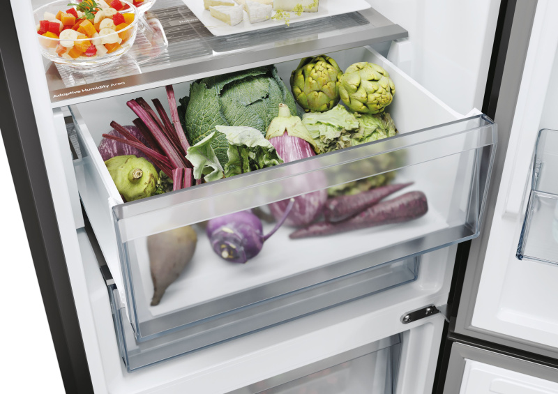 Szuflada Adaptive Humidity Area z automatyczną regulacją poziomu wilgotności dba o to, aby owoce i warzywa były świeże aż dwa razy dłużej. Wszystko to dzięki specjalnej membranie z włókien naturalnych Natura Fiber, która utrzymuje wilgotność na poziomie 80%.
