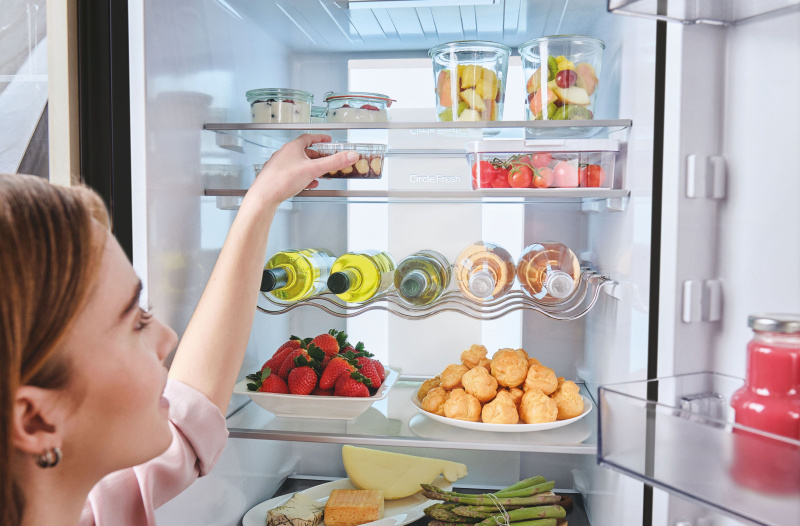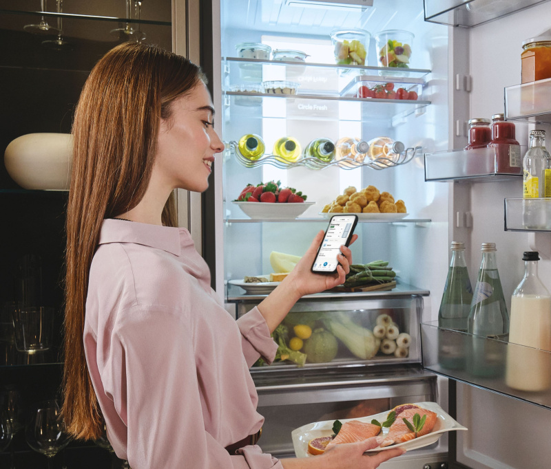 Sygnalizacja świetlna na froncie lodówki, będąca elementem zintegrowanego uchwytu, informuje o niedomkniętych drzwiach, o statusie połączenia z siecią Wi-Fi, czy też o zmianach temperatury czy wilgotności. Urządzenie jest także bardzo ciche (38 dB) i nie zakłóci naszego spokoju nawet gdy śpimy w salonie z aneksem kuchennym.