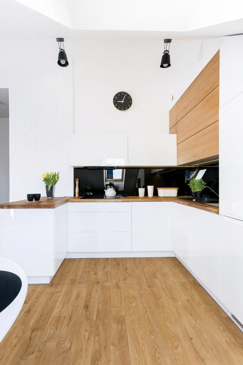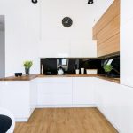 Gdy w kuchni nie ma okna, warto rozważyć opcję połączenia jej z salonem, dzięki czemu zyskamy nie tylko naturalne światło, ale również dodatkową przestrzeń. Jeśli wolimy kuchnię zamkniętą, postawmy na jasne, pastelowe kolory – zarówno ścian, jak i zabudowy meblowej. Zdecydowanie wystrzegajmy się kolorów jaskrawych i ciemnych. Dodatkowo, warto wybrać błyszczącą zabudowę. Połyskliwe fronty szafek odbijają światło, dzięki czemu optycznie powiększają wnętrze.