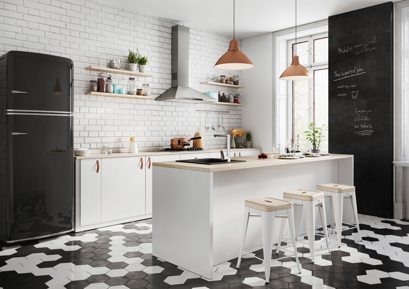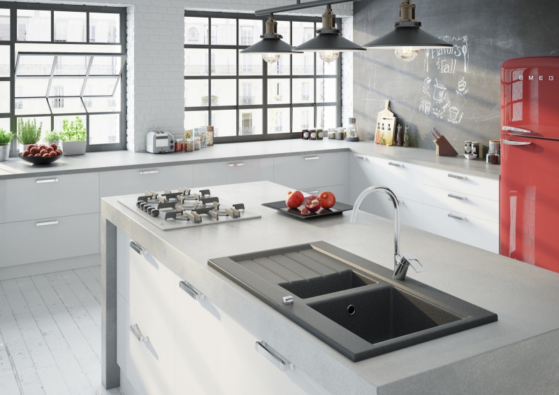 Same biele i szarości mogą sprawiać wrażenie chłodu, monotonii i sterylności. Ocieplimy i przełamiemy takie zestawienie dodatkiem akcesoriów kuchennych w innym kolorze, na przykład wykonanymi z dodatkiem miedzi naczyniami czy lampami. Możemy zastosować drewniany blat roboczy w ciepłym naturalnym odcieniu. Dla kontrastu wstawmy jeszcze czarną lub czerwoną lodówkę, a fragment ściany pomalujmy czarną lub grafitową farbą tablicową. Przyda się na bieżące notatki lub do rozwijania artystycznych talentów przez towarzyszące nam w kuchni dzieci. Na podłodze niech powstanie czarno-biała mozaika z płytek albo połóżmy tam odpowiednio zaimpregnowane, olejowane deski, współgrające barwą z drewnianym blatem roboczym. Dopasujmy kolorystycznie granitowy zlewozmywak i baterię do kompletu. A może zdecydujemy się na zlewozmywak stalowy i stalową baterię?