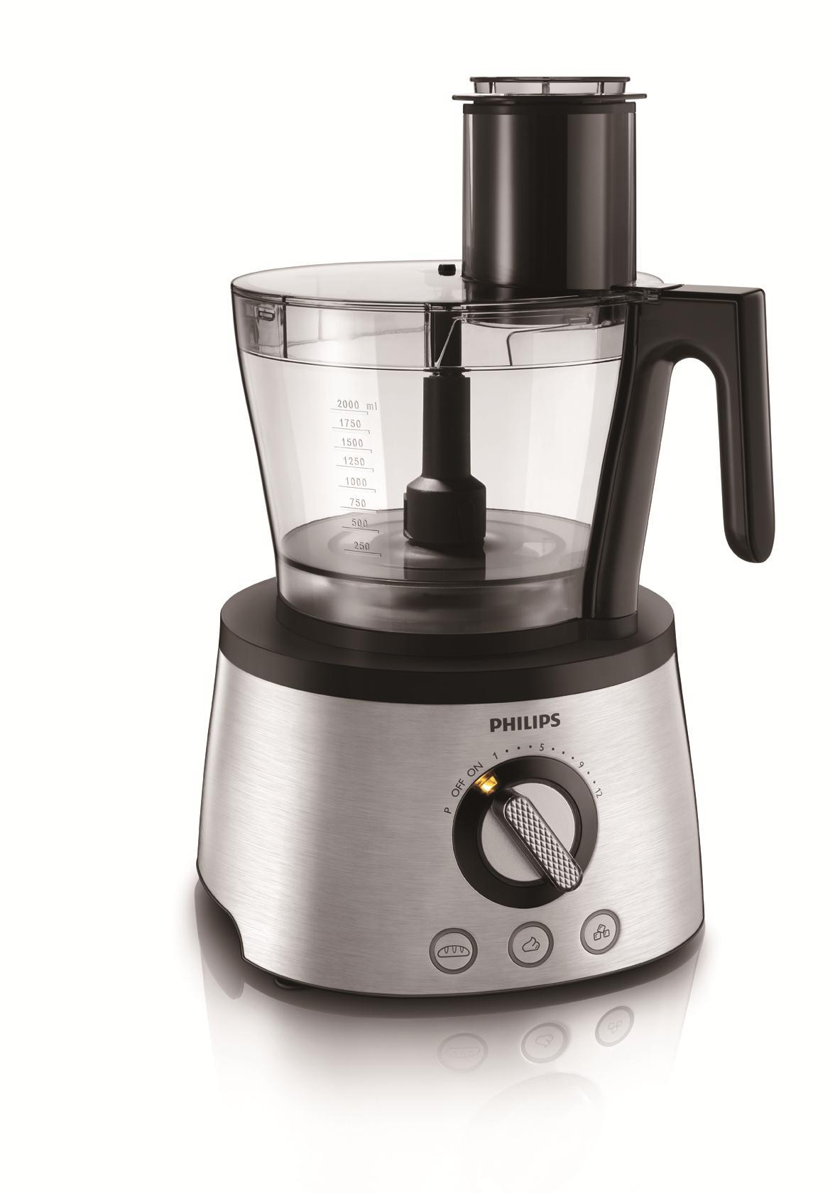 Silnik o mocy 1000 W, 12 ustawień prędkości, 4 ostre tarcze ze stali szlachetnej, duży otwór na produkty i pojemna sokowirówka to tylko niektóre z zalet robota kuchennego Philips Avance Collection.
