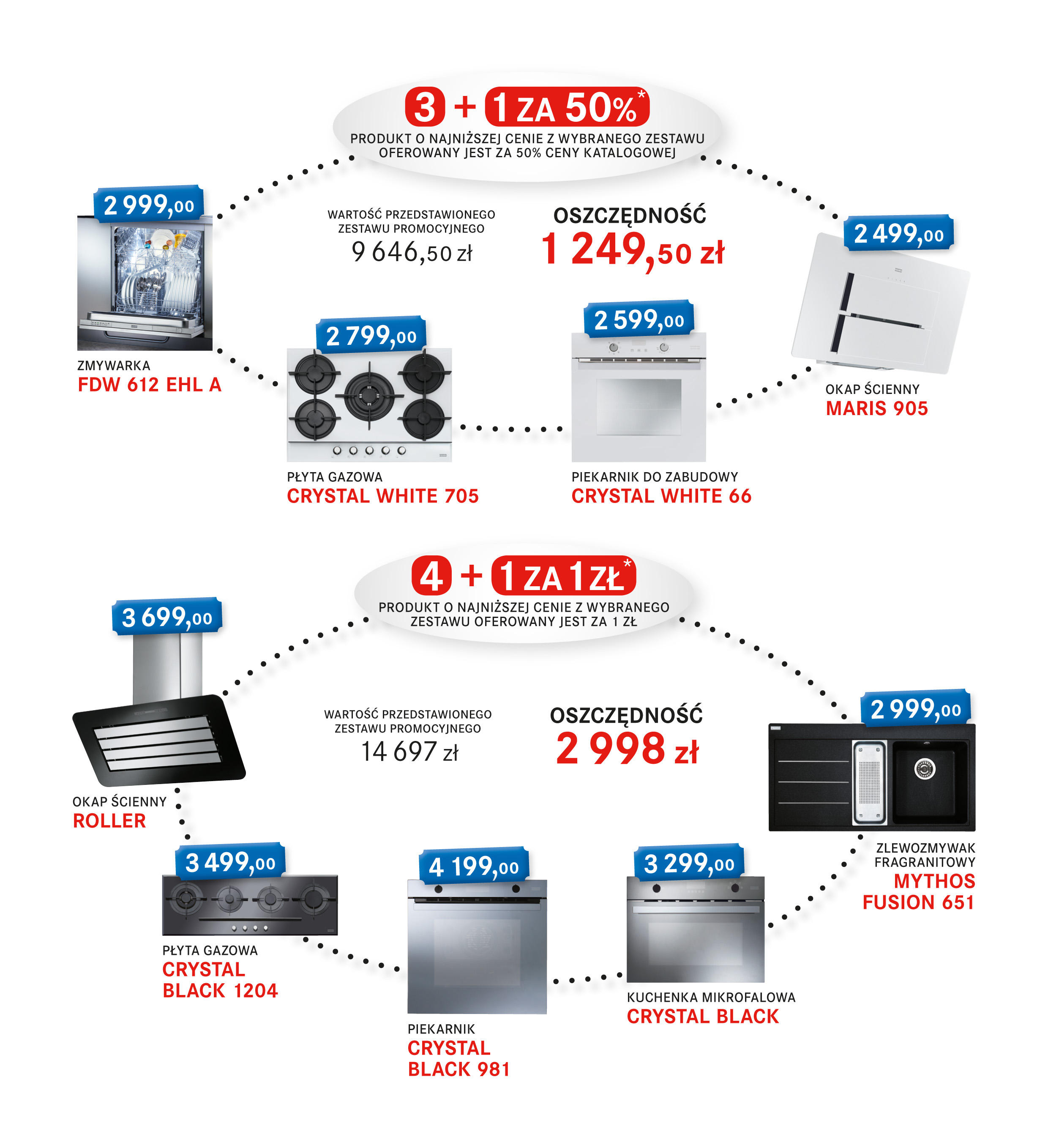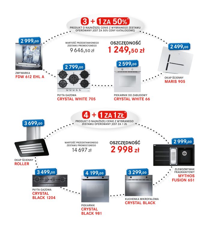 Pakiet promocyjny 3+1 za 50% oznacza, że decydując się na zakup czterech sprzętów, w tym przynajmniej trzech z grupy urządzeń AGD, za produkt o najniższej cenie zapłacimy jedynie 50% ceny katalogowej. Natomiast pakiet 4+1 za 1zł sprawia, że możemy zdecydować się na system zbudowany z pięciu elementów, w tym przynajmniej trzech urządzeń AGD. Cena najtańszego produktu z wybranego zestawu wyniesie wtedy symboliczną złotówkę.