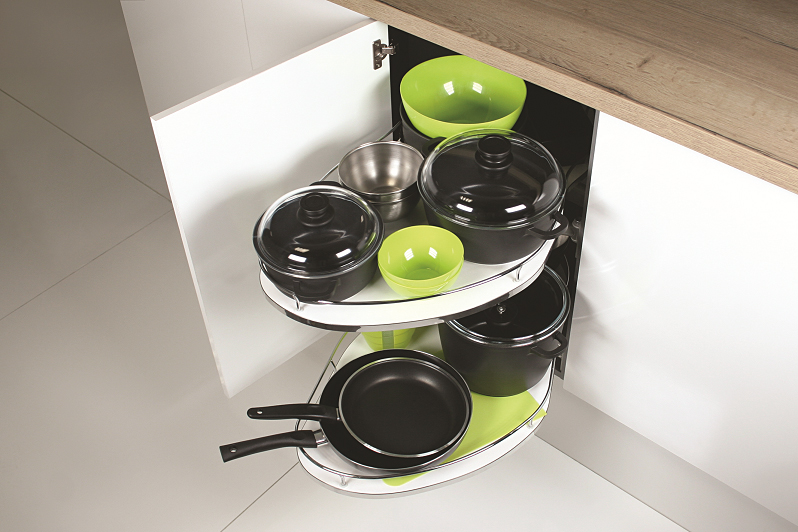 Dobrym miejscem do przechowywania dużych sprzętów i naczyń są też szafki rogowe. Pod warunkiem jednak, że i tu zatroszczymy się o montaż systemów wysuwnych. Znakomicie sprawdzą się kornery marki REJS np. Corner Front i Corner Comfort. Warto zwrócić uwagę na Corner Optima. Relingi i sam kształt półek tego systemu są delikatnie zaokrąglone w poszczególnych punktach, tak by zmieścić na nich jeszcze więcej rzeczy, które mają owalny lub okrągły kształt.