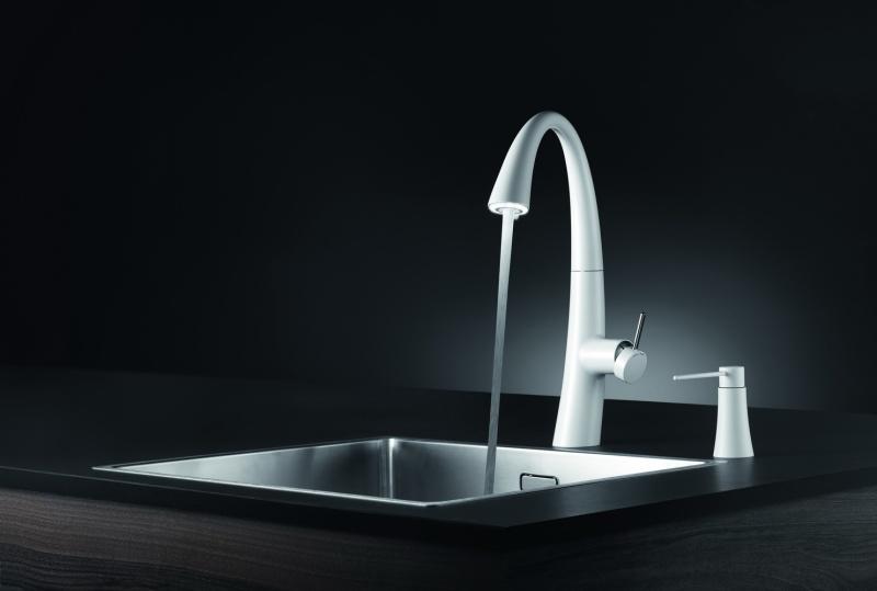 Bateria kuchenna KWC Zoe dostępna jest w chromowanej lub gładkiej stalowej wersji oraz w bieli i czerni. Nagrodzona w międzynarodowym konkursie IF Design Award 2016 oraz Top Design Award 2016, cieszy się niesłabnącą popularnością wśród klientów na całym świecie.