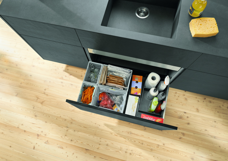 Zamiast tradycyjnego kosza ukrytego za drzwiczkami, pomyśl o szufladzie z pełnym wysuwem, która zagwarantuje optymalny dostęp do każdego z sortowników na śmieci i wykorzysta w pełni przestrzeń wewnątrz szafki. Zmieścisz w niej również duże detergenty. Jeszcze więcej przestrzeni uzyskasz, dodając szufladę wewnętrzną ukrytą za frontem. Czy może być wygodniej? Zamontuj elektryczny system otwierania SERVO-DRIVE. Wystarczy nacisnąć front kolanem i szuflada otworzy się sama!
