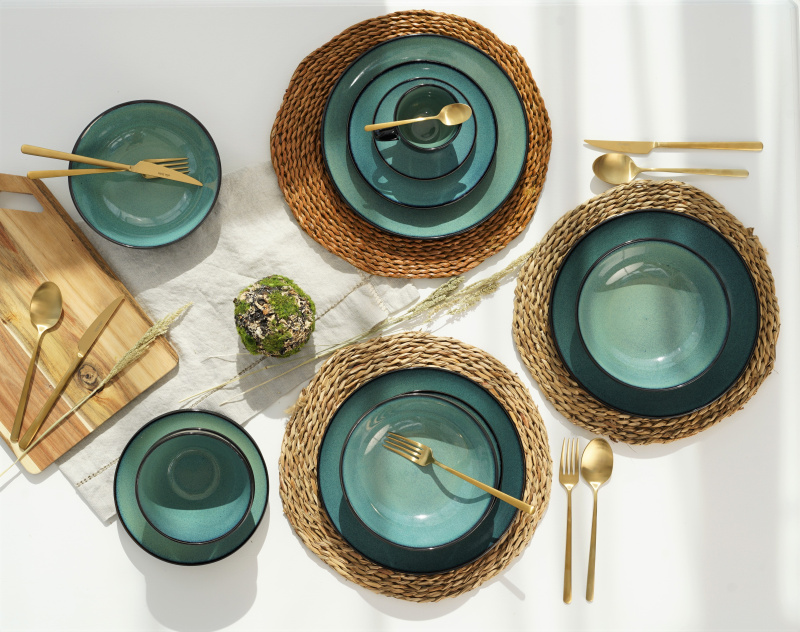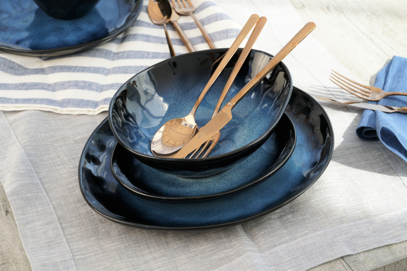 Komplety w odcieniach złota, o pięknym połysku, fantastycznie odnajdą się w aranżacjach glamour. Zestawy o matowym lub satynowym wykończeniu można także wykorzystać we wnętrzach o bardziej minimalistycznym charakterze. Bardzo dobrze współgrają z drewnianymi elementami zastawy, ale i z porcelaną. Miedziane będą wyglądać doskonale z zastawą w ciepłych odcieniach bieli lub granatem. Czarne zaś są na tyle uniwersalne, że można je bez problemu połączyć niemal z każdą zastawą.