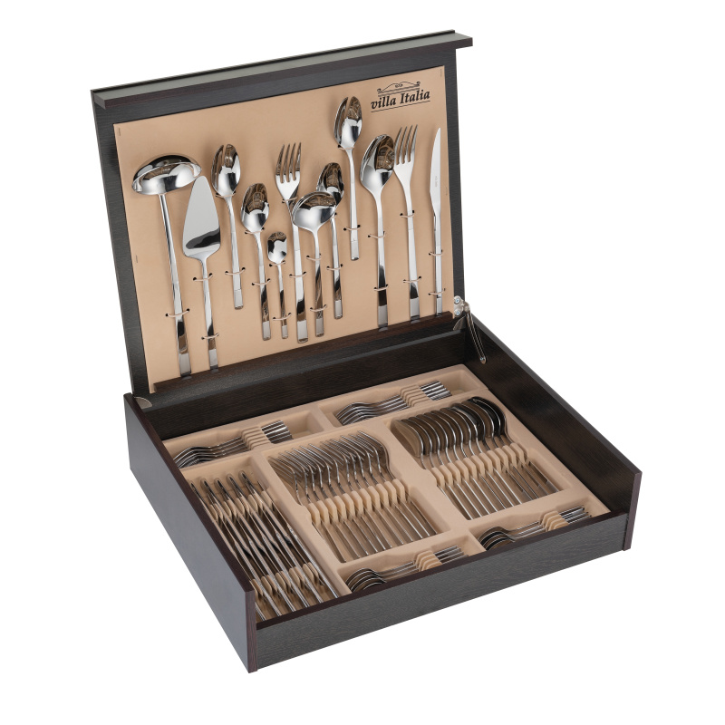 Warto zainteresować się, chociażby zestawami na 12 osób, które pakowane są w eleganckie drewniane kasety, marki Villa Italia. To komplety składające się z aż 72 elementów, wśród których znajdują się sztućce serwingowe służące do nakładania potraw, jak np. łyżka wazowa, sztućce do sałaty czy łopatka do tortu. Trwałe, pięknie wykonane, będą trafionym prezentem, który sprawdzi się zarówno na co dzień, jak i podczas uroczystych okazji.