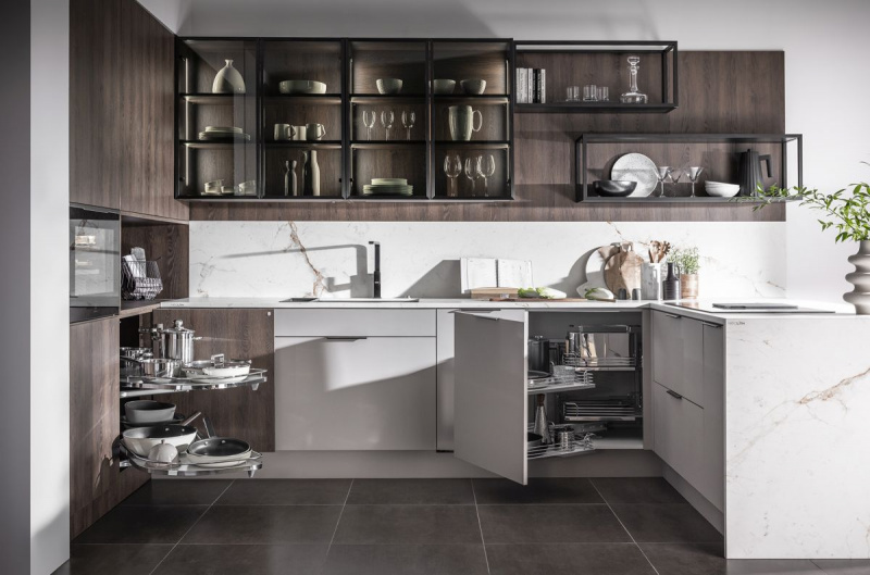 Coraz silniejszym trendem są szafki aż do sufitu. Dzięki takiemu rozwiązaniu zyskujemy nie tylko dodatkową przestrzeń do przechowywania, ale i optyczną harmonię. Innym sposobem na nieustający porządek (lub inaczej: ukryty nieporządek) jest system wysuwanych drzwi, który daje możliwość schowania roboczej części kuchni.