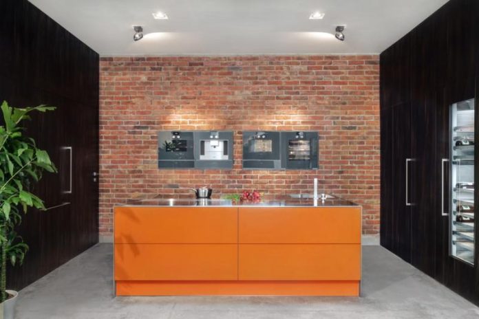 Najbardziej charakterystycznym elementem kuchni jest stalowy blat o grubości 8 mm, który zachodzi na boki wyspy. Jego jednolity charakter dodatkowo podkreśla zintegrowany zlew, a także zlicowana z powierzchnią płyta indukcyjna oraz wysuwany elektrycznie pochłaniacz. Dwa szerokie fronty wyspy wykończone zostały matowym lakierem w ciemnym odcieniu koloru pomarańczowego. Mieszczą się za nimi wysuwane elektrycznie stalowe szuflady z autorskim wykończeniem wewnętrznych boków w lakierze – tym samy jak na całości wyspy. Innym praktycznym udogodnieniem jest zmywarka, również otwierana elektrycznie na dotyk.