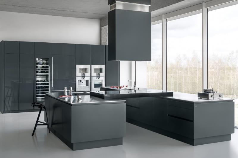 Widoczny na zdjęciach model wykończony został w grafitowym lakierze. Wysoka zabudowa z połyskującymi frontami jest tłem dla podwójnej wyspy wykończonej w półmacie. Wyspa kuchenna składa się z dwóch elementów, w których oddzielnie umiejscowiono strefy gotowania i zmywania. Meble połączone są elementem z konglomeratu kwarcowego, w którym znajduje się płyta indukcyjna. Otaczająca użytkownika wyspa jest niezwykle ergonomicznym rozwiązaniem i ma wysokie walory estetyczne, co jest szczególnie istotne w przypadku kuchni otwartych. Lekkości zabudowie dodają stalowy blat Blanco o grubości zaledwie 12 mm zespolony ze zlewozmywakiem. Nawiązują do nich szuflady Hettich, także w stalowym wykończeniu. W kuchni zamontowano wysokiej klasy urządzenia Gaggenau. W wysokiej zabudowie znajduje się podwójne cargo Tandem firmy Peka. www.zajc.pl
