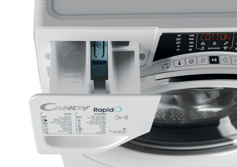 W pralkach Candy RapidO dostępna jest także zaawansowana technologia automatyki wagowej KG Detector, która dostosowuje parametry prania – takie jak ilość wody, długość cyklu prania i szybkość wirowania – do wielkości wsadu. A gdy wykryje obecność piany, w razie potrzeby zwiększa ilość wody podczas płukania.