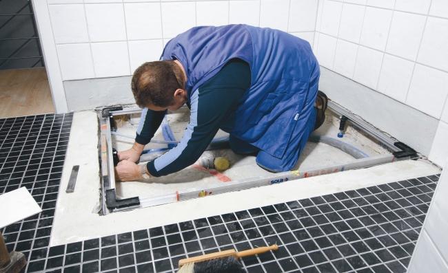 W tak przygotowanym wgłębieniu instalator może zamocować ramę montażową ESR II. Do ustawienia właściwej wysokości zabudowy służą nóżki, których zakres regulacji wynosi 67 – 164 mm. Rama może być stosowana nawet w przypadku wgłębienia o wysokości zabudowy 49 mm. W przypadku, kiedy wysokość zabudowy nie przekracza 107 mm konieczne jest podkucie na syfon lub zastosowanie specjalnego syfonu z pionowym odpływem. Aby nóżki ramy nie kolidowały z istniejącą instalacją odpływową, można przesuwać je w poziomie. Ważnym etapem montażu jest dokładne wypoziomowanie ramy przy pomocy poziomicy. 2 nóżki ramy ESR II wyposażone są w mocowanie do podłogi, dzięki któremu rama jest stabilnie przymocowana.
