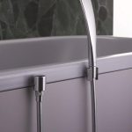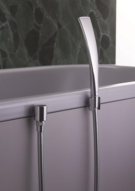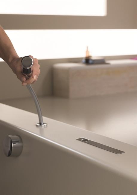 Uzupełnieniem systemu armatury Kaldewei Comfort Select jest wygodny, dostępny w zasięgu ręki, elektronicznie sterowany prysznic wbudowany w wannę. Jego wąż może być chowany w rancie lub też przymocowany z boku wanny dzięki specjalnemu, atrakcyjnemu optycznie uchwytowi. Sama słuchawka prysznica jest indywidualnie dobierana do całej armatury łazienki i mocowana adekwatnie do rozwiązania przyjętego dla węża. Sterowanie prysznicem jest zintegrowane z elektronicznym panelem dotykowym systemu Kaldewei Comfort Select.