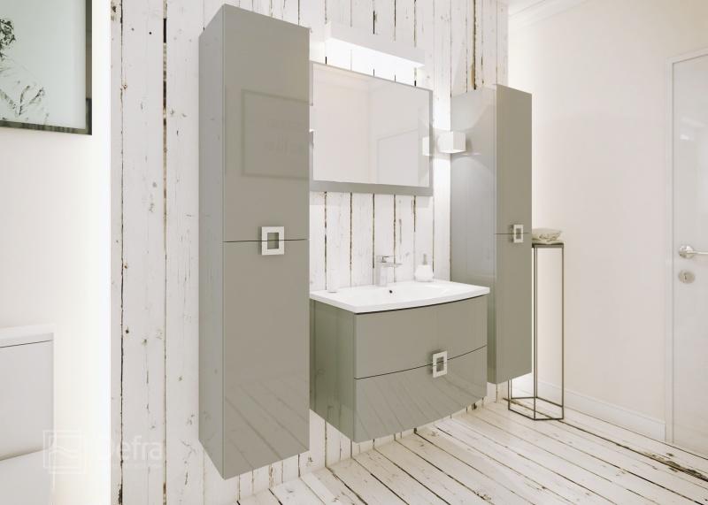 szafka podumywlakowa D80 – o szerokości 80 cm, wyposażona w 2 głębokie, pojemne szuflady, z prowadnicami z systemem cichego domykania DefraSoftClose. Fronty szuflad wykonano z wysokiej jakości płyty MDF o grubości 21mm, co zwiększa trwałość i komfort użytkowania mebla.- wysoki słupek podwieszany C32 – o wysokości 160 cm, z 2 uniwersalnymi drzwiami i przestronną przestrzenią do przechowywania z eleganckimi szklanymi półkami. Dla zwiększenia komfortu użytkowania szafkę wyposażono w zawiasy z systemem cichego domykania. Fronty mebla wykonano z wysokiej jakości płyty MDF o grubości 16cm, co znacznie zwiększa trwałość szafki.
